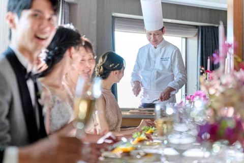 おふたりと親しい方々がテーブルを共にする少人数のご会食にもおすすめいたします。テーブルの向こうには、台場、羽田、横浜方面を見渡す眺めが広がります。